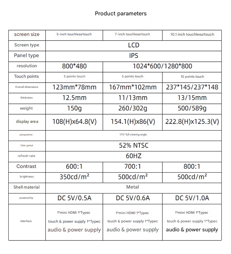 Specifications of 7-inch Orange Pi HDMI Portable Monitor