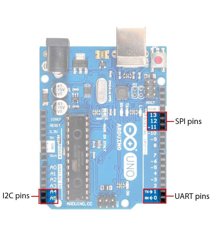 برد آردوینو Uno از انواع پروتکلهای ارتباطی مانند I2C، SPI و UART پشتیبانی میکند. پروتکلهای ارتباطی بیان شده برای این برد، به صورت جزئیتر به شرح زیر است: